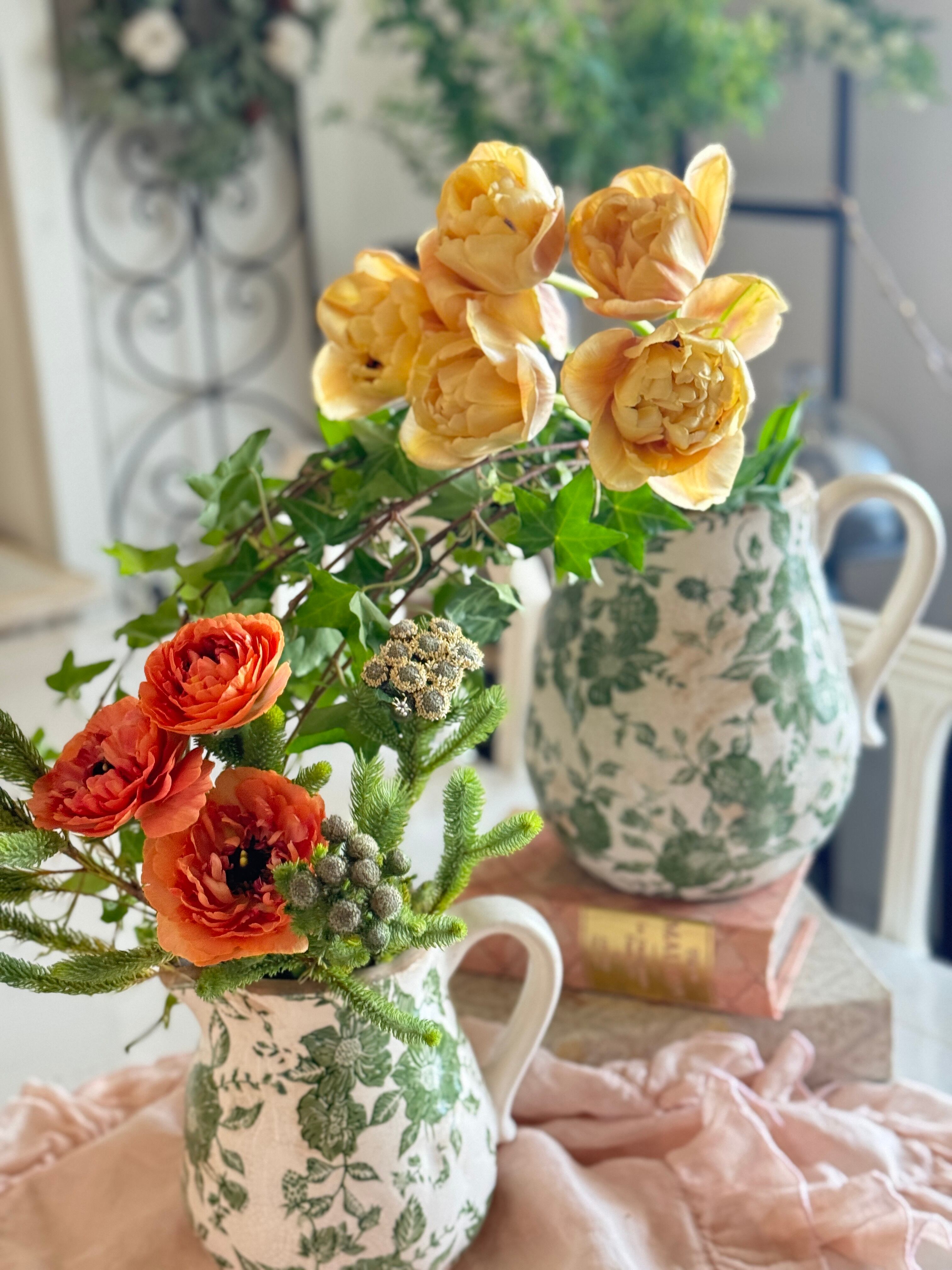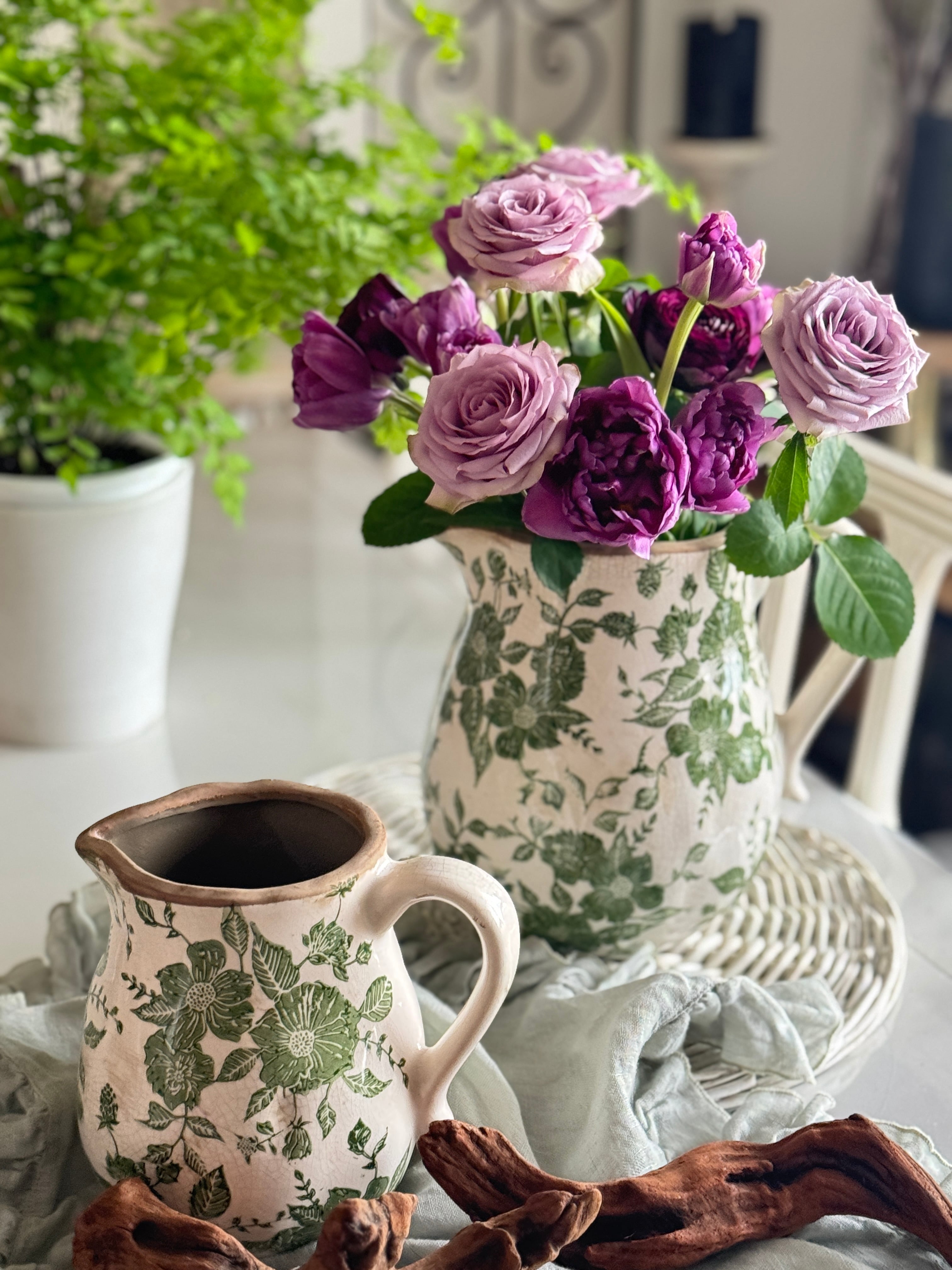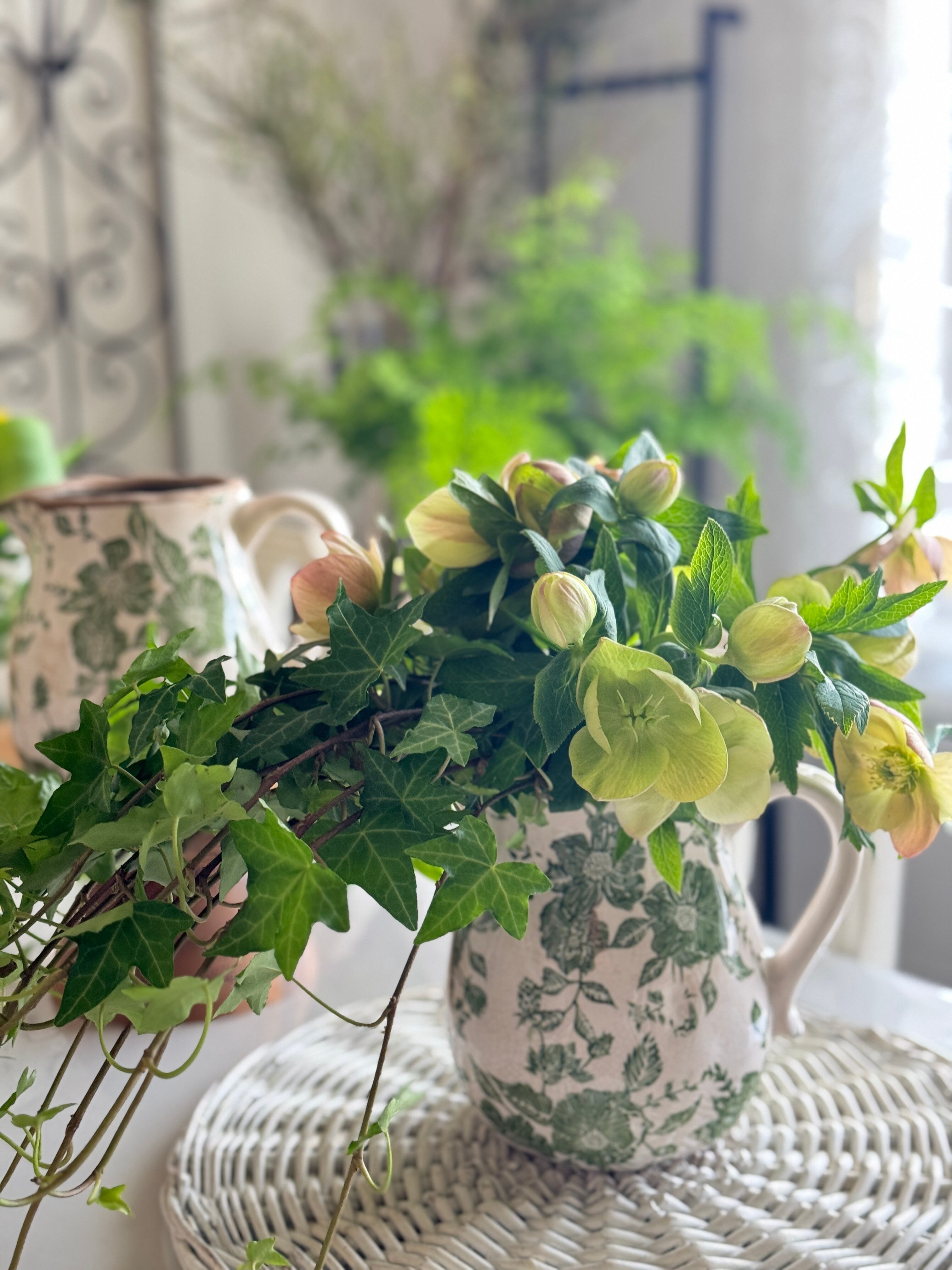 繊細なグリーン柄の花瓶に、季節の花々を束ねた、落ち着きと華やぎを兼ね備えた花瓶と花のセット商品です。
