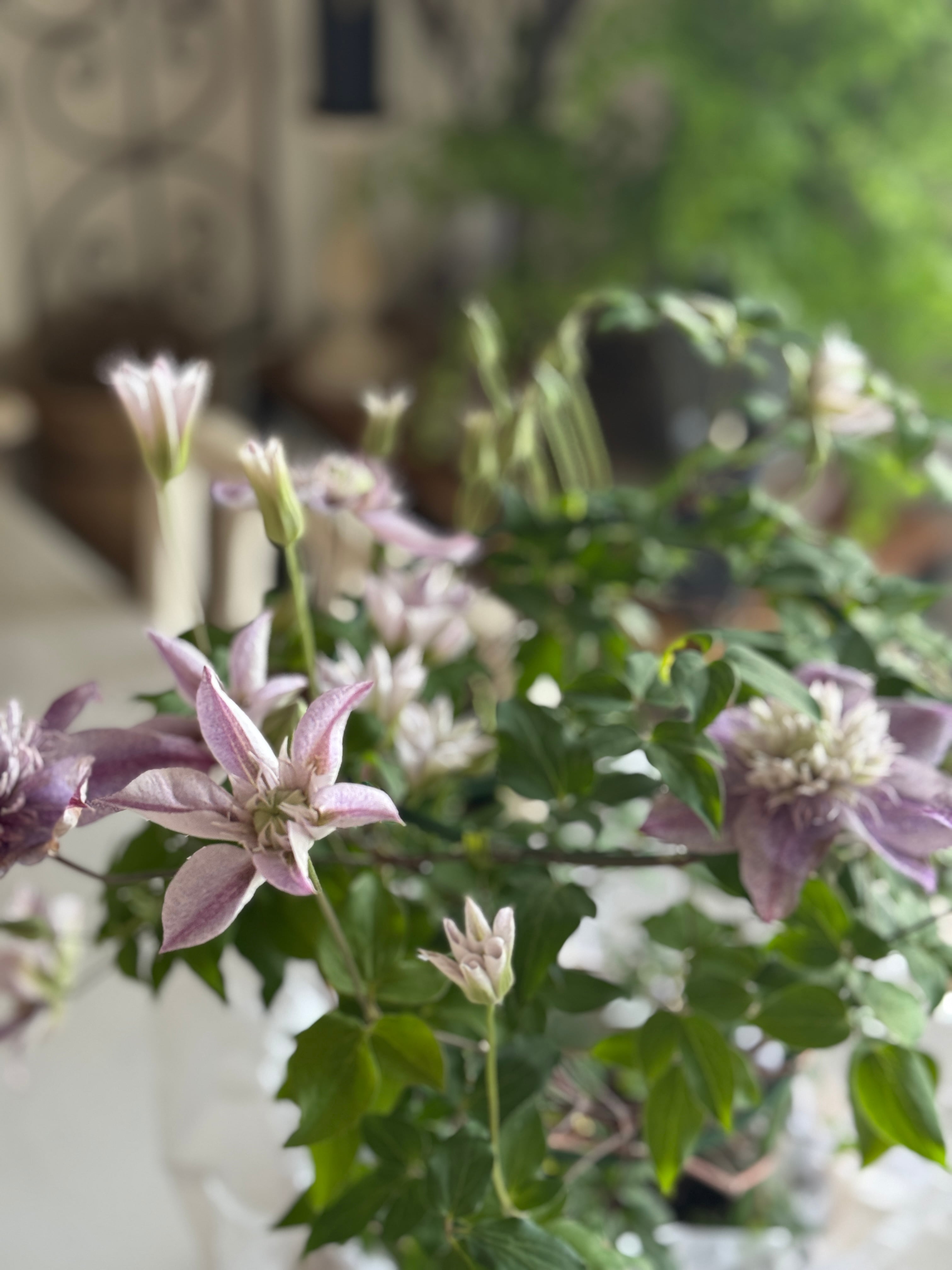 大人色のシックなクレマチスが品良く彩ってくれる鉢物です。