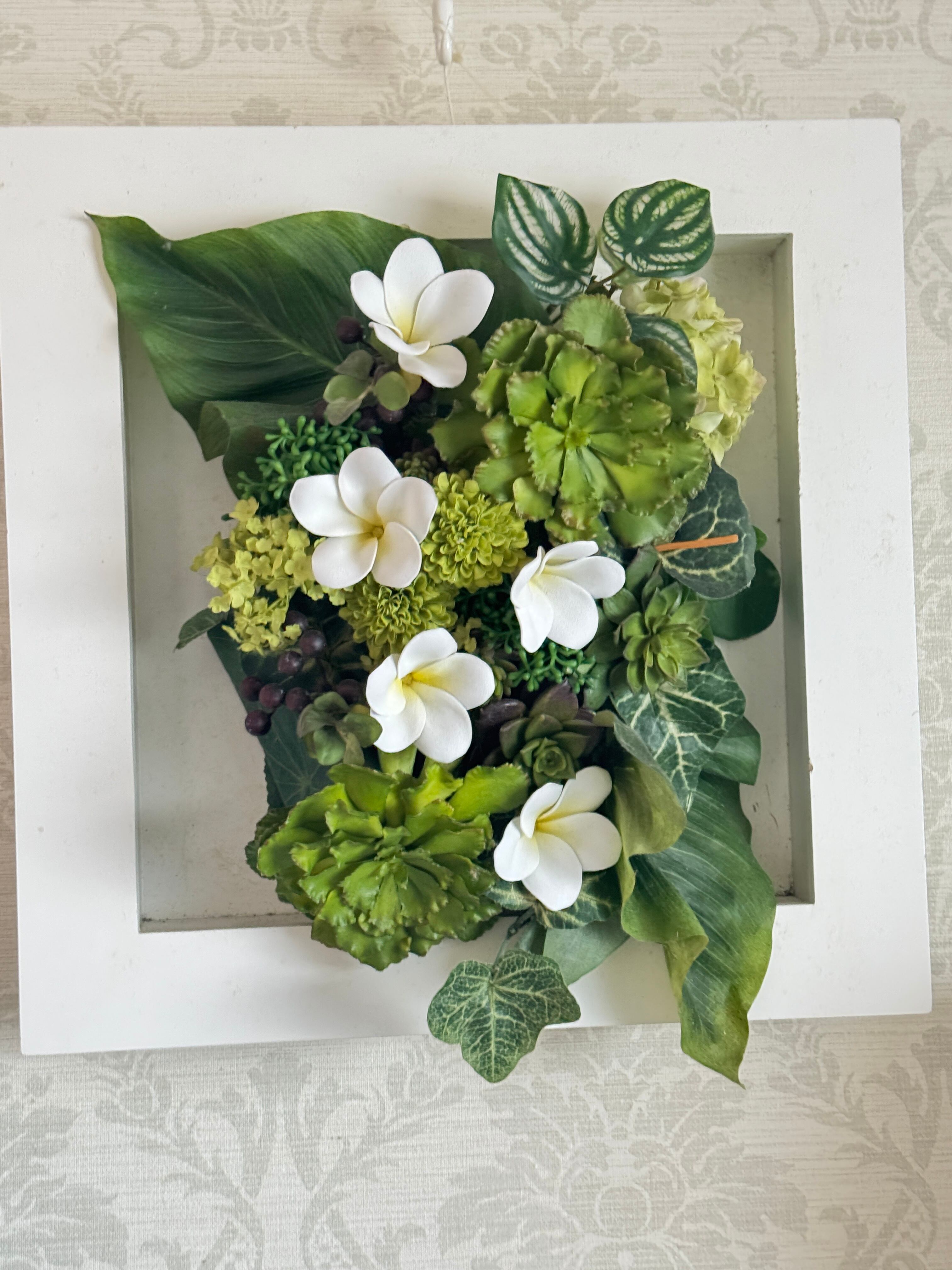 爽やかなグリーンの壁掛け インテリアフラワーの一つにお部屋にマッチする色合いです。